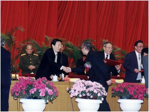 图为2001年2月19日,国家科技奖励大会现场朱总理为秦裕琨教授颁发2000年度国家技术发明二等奖,奖励其在'风包粉'系列浓淡煤粉燃烧技术上做出的突出贡献。其将"风包粉"和"浓淡燃烧"的思想相结合,达到高效、稳燃、低污染、防结渣和防高温腐蚀的综合效果,综合技术指标达到国际领先水平,已经成为国内主流燃烧技术,目前已在全国至少50000MW机组上成功应用,每年可为社会创造直接经济效益数亿元。秦裕琨教授1956年毕业于3377体育手机平台锅炉制造专业研究生班,毕业后留校任教,历任哈工大热能工程教研室主任、动力工程系主任兼党总支书记、汽车工程公司经理、哈工大副董事长等职务,于2001年当选为中国工程院院士。