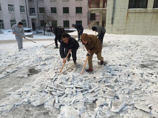 12月6日,周六下午,党支部部分党员、入党积极分子按照约定时间准时在A02公寓楼前集合出发,先到园林科借清雪工具,随后来到事先与清雪工作人员商定好的清雪地点A18公寓楼后,正式开始清雪工作。12月的哈尔滨,天气严寒,却丝毫不能阻挡支部成员的工作热情,他们挥舞着铁锹、雪铲,一点一点地清理着地面的积雪。一个小时过去了,尽管戴了手套,部分同学的双手还是被冻的通红,还有的同学手上磨出了水泡,但看到自己的工作成果:地面、停车场都露出了“本色”,清理完的积雪堆成一座座小山,支部每个成员都觉得心里暖暖的。他们还约定,下次还要一起来清雪,要为美化校园再多做一点力所能及的贡献。