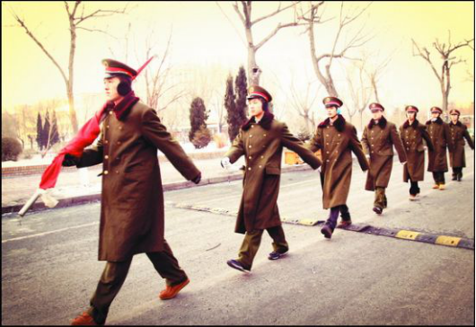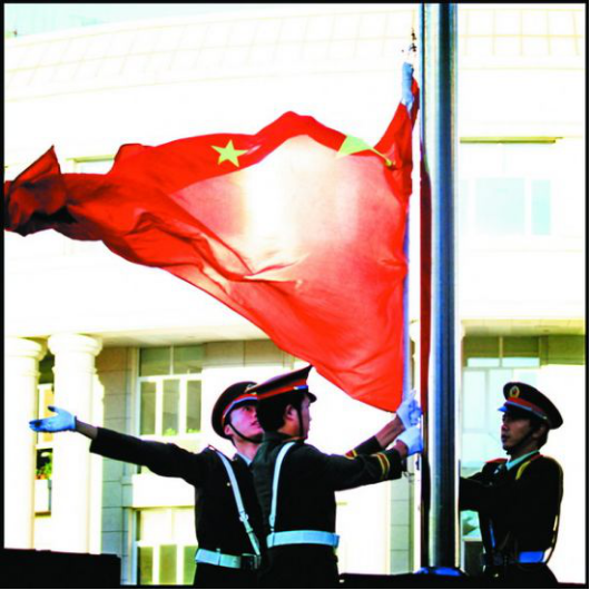 任何奉献都是苦中作乐,升国旗也是如此:因为国旗广场离公寓比较远,6:15就得准时从公寓门口出发,借着东方的一点微亮队员们以最饱满的姿态向那一方神圣的土地进发,路上还是有一些晨练的同学的。因为冬天的早晨天特别冷,寒风直往裤管里灌,刺骨的寒意迅速传遍全身,刮在脸上更是像刀刮一般难忍,很快双腿就像冰过一样冻得僵直,每踢出一步全身都在用力。尤其是擎着国旗的那支手更是冻得要命,因为套国旗的杆是一个钢管,握在上面就像一排排针刺在手上,并且整只胳膊要保持不动,常时间这么坚持着根本就没了知觉。但肩上的国旗告诉他们:这是一项神圣的使命,就算是再困难也要坚决完成任务!在挂旗的时候手一直在不停的抖,是寒冷,还是激动?此时义勇军进行曲奏响,将国旗用力的向空中挥去,这鲜红的一抹红色迎着朝阳冉冉生起,此时的他们热血沸腾,像一团火向上涌动,每拉动一下绳索,他们的心都会为之一颤,就在这一瞬间仿佛像是有了一次空间瞬移,像是员工们就站在天安门广场的旗杆下,他们就是那一个个庄严豪气的男子汉!回去的路上,虽然身上早已冻得的失去了知觉,但是心中的那团烈火还在熊熊的燃烧!此刻他们就是战士,就是最可爱的人!