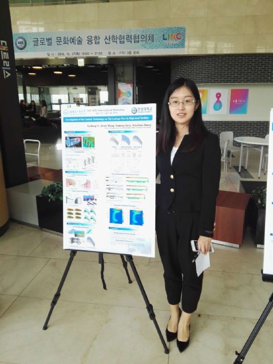 学习成绩上有了一定的提高后,对科技创新充满好奇和向往的她开始组队参加创新创业项目、节能减排大赛开启了自己的科创之旅,进入实验室和老师、师兄多多沟通、阅读查找大量中外文献,从最初好奇性的接触、到期间探索性的学习,再到最后加工成品参加比赛。这期间方案讨论、模型搭建、数据分析、论文修改,每一个过程听起来是那么的简单,水到渠成般轻松。但科研的路走过的人都知道,不是那么的容易与简单,在风雨中砥砺前行成为那时候她的口头禅。有时一个数据和模拟结果的偏差都会让她们反复进行实验和模拟很多次,因为科研的时间太晚,被宿舍管理员教育都是再平常不过的事了。也正是备战期间她和队友们夜以继日的奋斗和较真不服输的精神让她们顺通过初赛和网评,最后在决赛中获得一等奖,并于2016年8月受邀赴台湾参加东元国际科技大赛进行交流,10月随公司赴韩国汉阳大学参加学术交流和海报展示。一次次的比赛与交流让她开拓了视野,锻炼了口语表达能力,同时也更加明确了今后前进的方向。