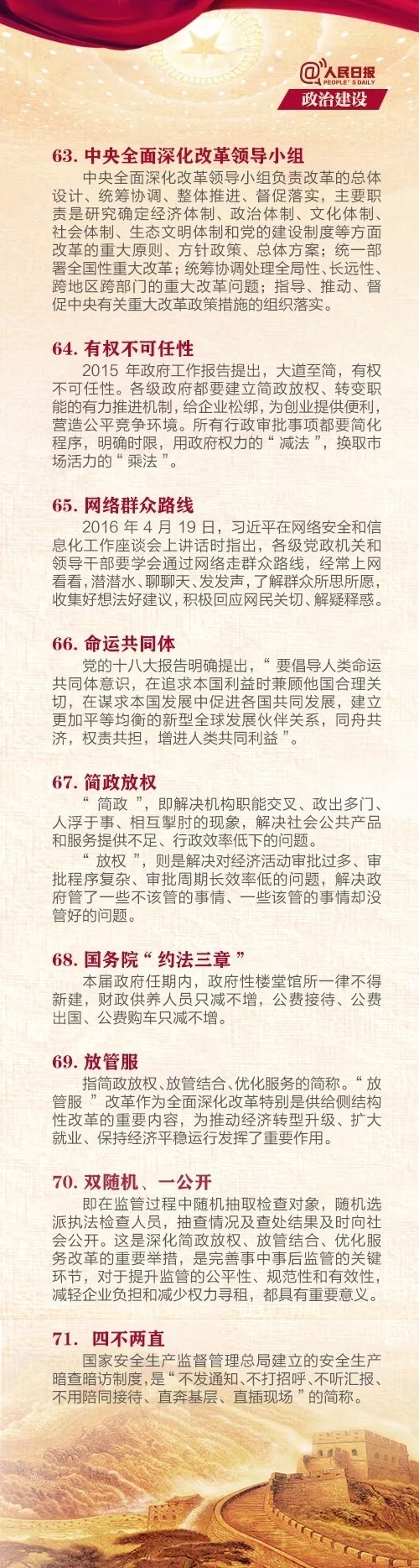 近日,为喜迎十九大的召开,人民日报、新华网、中国共产党新闻网、中国政府网整理了党中央治国理政的一百个新名词:“中国特色社会主义”、“两学一做”、“三严三实”、“四个全面”战略布局、“五大战区”、“分享经济”、“放管服”等最新名词解释应有尽有,3377体育团委、员工骨干经过阅读和学习,向所有团员青年发出号召,在各团总支、团支部推广学习,希望团员青年积极学习、踏实认真、不忘初心、砥砺前行,争学榜样、争做榜样,以良好的理论基础、饱满的精神风貌迎接党的十九大。