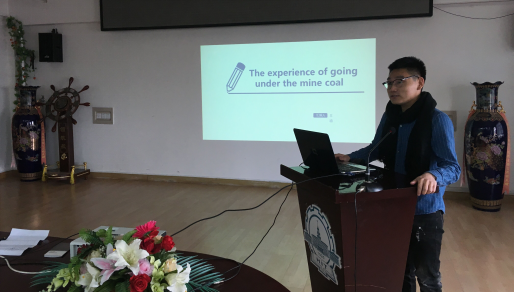 会上,唐肇求同学以“我的西北行”为题分享了其毕业旅行的经历和感悟,介绍了西北的风土人情以及旅游的注意事项。其声情并茂的演讲激起了大家出去走走游览祖国大好河山的冲动以及对西北自然美景的无限向往。王迪同学则分享了其本科期间两次深入矿井的实习经历,介绍了中国煤矿井下的工作环境,并与美国的矿井条件做了比较。从王迪分享和对比中大家深刻认识到了中国煤矿工人的艰苦,他们在如此恶劣的环境下默默为祖国做贡献的伟大精神深深地感染了与会的全体人员。