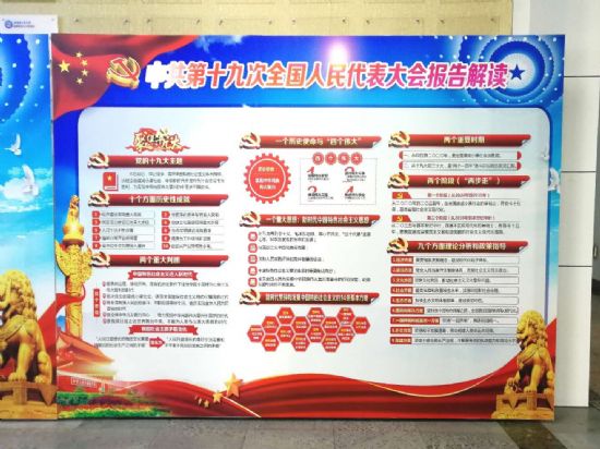 党的十九大胜利召开之后,3377体育全体师生持续学习十九大精神,并在公司一楼制作了十九大报告解读展板。近日,按照中宣部《关于印发〈“学习贯彻党的十九大精神”宣传挂图〉的通知》及校宣传部要求,3377体育根据实际情况,利用公司电子屏、宣传栏分别滚动循环播放“庄严时刻”“历史重托”“重要思想”“神圣使命”四大板块内容,广泛、深入宣传和学习十九大精神,让十九大精神融入公司每一位师生心里,感召在未来的实际行动中。