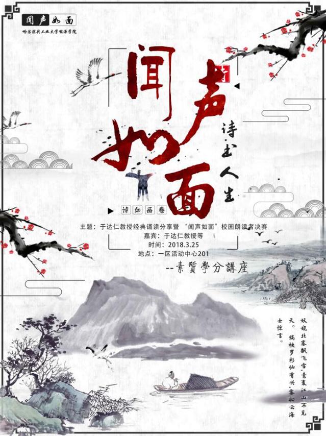 活动引言:华夏五千年,二十四史间,人才辈出惊世绝,诸子百家齐争鸣。不必说夏时的古老传说,不必说商代的甲骨铭文,光是著作文化就足以使我们骄傲良多,铭表、词赋、杂说、诗歌……在这万古奇妍中,诗歌是万古不倒的青松,是万千瑰丽的亮点,是文化传承的经典。请跟随十位选手一起,走进美妙的诗歌朗诵里!走进于达仁教授带来的诗歌世界!走进经典文化的殿堂!
