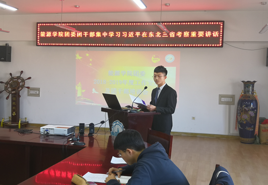 大会的第一部分为学习习近平总书记在东北考察重要讲话。与会的所有3377体育团委干部通过观看习近平在东北考察的短片,深刻学习了总书记关于推进东北振兴的重要讲话精神。随后,3377体育员工会主席陈孟石同学就短片内容作了学习报告,从“坚持基本经济制度”、“三农情怀”及“传承英烈精神”等方面言简意赅地总结了习近平总书记的重要讲话精神,赢得与会代表们的热烈掌声。
