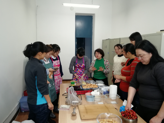 公司办公室齐心协力,提前一天就准备好了棉花糖、花生、蔓越莓、面粉、糖等系列新鲜食材,并号召院内女职工准备一起学习制作茶点。院办张蕊老师精心为每位教职工讲述制作过程,边说边做,从称重、配料、时间等几个方面详细地说明了牛轧糖的做法,其他各位老师边听边记,在第二轮制作的时候就动手尝试起来。琥珀核桃仁比较简单,大家听过一次就明白了具体做法。在等待牛轧糖凉透的过程中,又一起制作了山楂糕。待所有茶点都制作完毕,女职工们纷纷送给其他老师品尝,共同分享美食和乐趣。