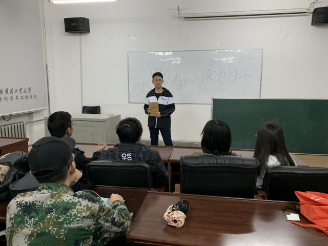 本次活动在由副班长樊栩宏主持,首先由他向全班同学推荐好书——《追风筝的人》中的那句“为你,千千万万遍”令每个人都为之感动, 这不只是一个孩子兴奋时喊出的话语,而是一句耀眼的承诺,我们做的不需要太多,不过只是珍惜眼前人,珍视身边事罢了。除此之外,樊栩宏还跟同学们分享了一本极富佛学哲理的书籍——《仓央嘉措诗集》,他表示在这个物欲横流的世界,这本诗集更像是洗涤每个人心灵的一副良药,让每个人能打破各自隐形的枷锁,在书中找到真实的自己。在副班长抛砖引玉的作用下,团支部的同学们都踊跃地上前分享自己读过的好书,讲述自己的读书感受,并且在分享的过程中进行了积极的讨论,每个人都提出了自己独到的见解和看法。