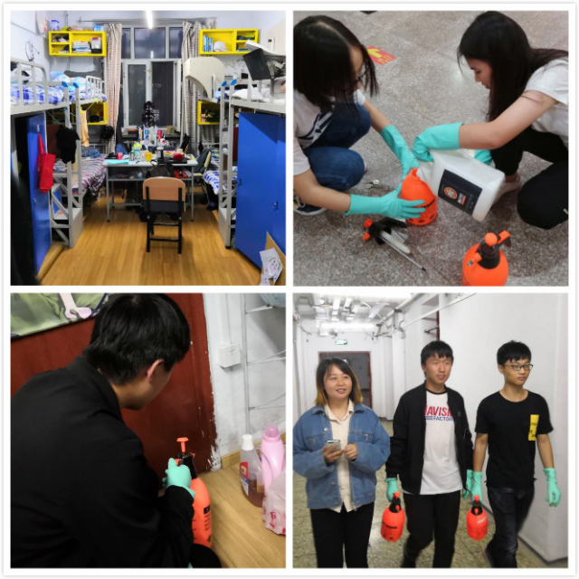 本次活动分为男女队分别展开。辅导员邓冰冰老师带领男生队伍对A02公寓宿舍进行消毒及检查,并为每一间已消毒的房间开窗通风;女生A04公寓队伍由社会实践部部长任姿颖带领进行。整个过程共计四十分钟,保证每一间宿舍都得到了良好的消毒效果。此外,寝室卫生情况普遍良好,希望好的寝室继续保持,有待改进的寝室稍加注意。