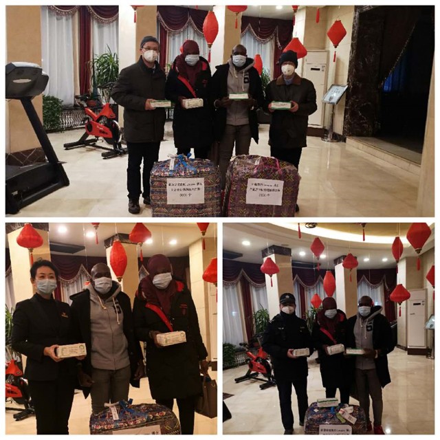 年初以来,我国上下万众一心抗击疫情的动人场面深深感染了来自贝宁的公司外籍团队Guene Lougou Bachirou。他虽远在家乡贝宁休假,却始终心系中国疫情动态。他千方百计利用自己国家(贝宁)的人脉,自费购置了这批口罩。由于担心国际物流不稳定,难以保障货品准时送达,他决定和自己新婚的爱人一起将这些口罩亲自背回哈尔滨。他是这样说的:“在哈工大学习的日子里,老师们悉心培养我、指导我,我很感激母校把我培养成为今天的团队博士后,为母校筹集防疫物资,是我应该做的事。”