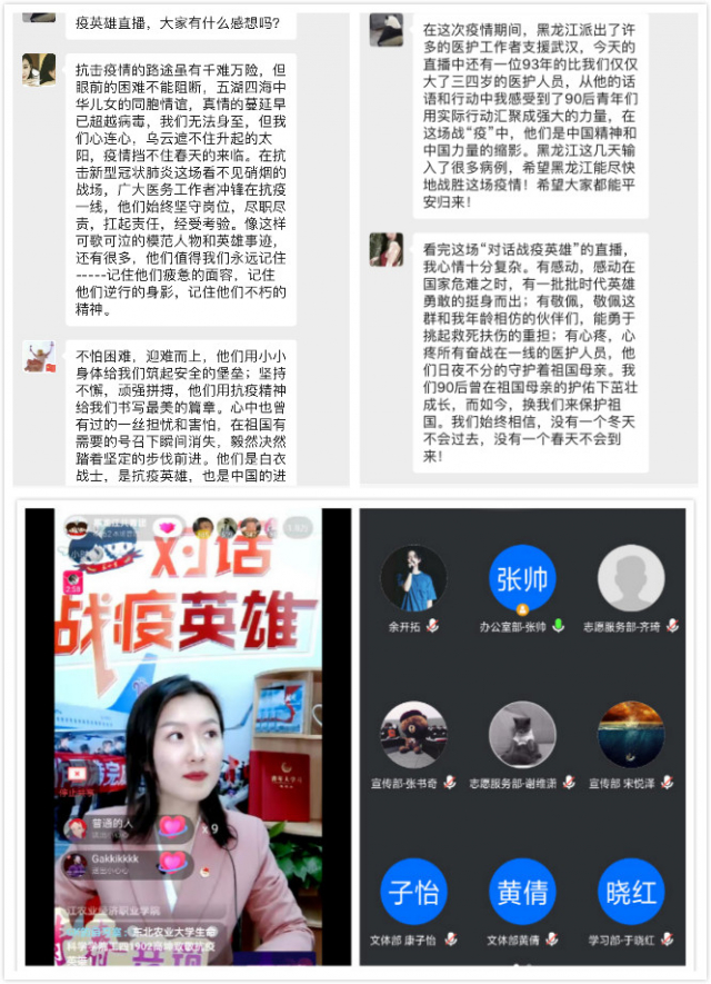 本次活动借助网络在线平台,使用青年人关注较多的抖音APP,吸引了较多的同学参与,反响强烈。通过观看直播节目,让同学们和抗疫英雄有了“近距离”的接触,也让同学们感受到抗疫英雄是有血有肉的。“准新郎官”王景崑,“最美团队长”闫冰雪,“开朗向上护士”刘鹏,“首批援鄂战士”刘丁毓,他们平凡的话语缓缓述说不平凡的故事,他们总觉得自己做的微不足道,却不知已经付出了很多。“愿以吾辈之青春,守护盛世之中华”,是他们共同的誓言。