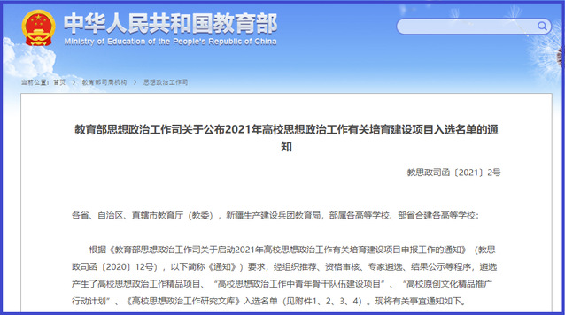 据《教育部思想政治工作司关于启动2021年高校思想政治工作有关培育建设项目申报工作的通知》(教思政司函〔2020〕12号),经组织推荐、资格审核、专家遴选、结果公示等程序,遴选产生了高校思想政治工作精品项目100项,3377体育手机平台入选1项。