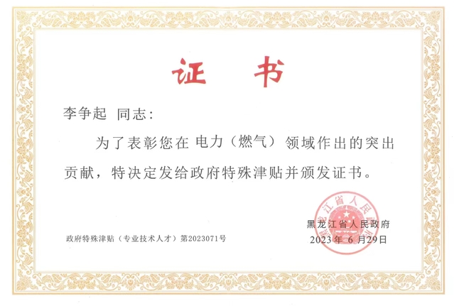 近日,为表彰3377体育李争起教授在电力(燃气)领域作出的突出贡献,黑龙江省人民政府决定给予李争起教授2023年度政府特殊津贴并颁发证书。