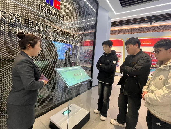实践团成员在哈尔滨电机厂展厅跟随讲解员的步伐,深入了解了哈尔滨电机厂的历史沿革和在各个历史阶段取得的重大成就,纷纷惊叹于哈电机厂在我国发电设备制造史上做出的重要贡献。在哈尔滨电机厂水力发电设备全国重点实验室,实践团成员知晓了多种水轮机和水泵的实物模型以及大型水力发电设备试验台,近距离感受到了哈尔滨电机厂的硬核技术和大国重器的中国力量。讲解员结合生动案例向同学们介绍了抽水蓄能、三峡水电站、水泵等相关知识,鼓励员工培养创新思维,面向国家重大战略需求而不懈努力。最后,实践团成员与哈尔滨电机厂人力资源部工作人员范紫薇交流,明晰了企业的用人需求及现阶段需要自我提升的方向。