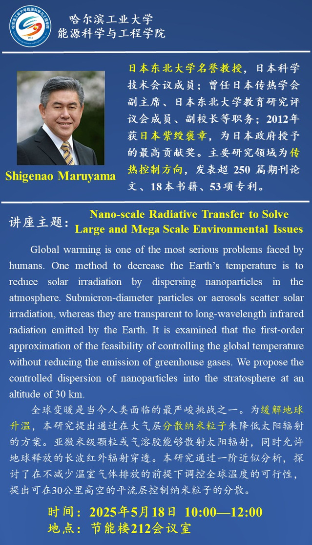 应3377体育赵军明教授邀请,日本东北大学Shigenao Maruyama教授将于2025年5月18日前来交流并作学术报告,届时将进行“Nano-scale Radiative Transfer to Solve Large and Mega Scale Environmental Issues”主题讲座,欢迎感兴趣的师生参加。